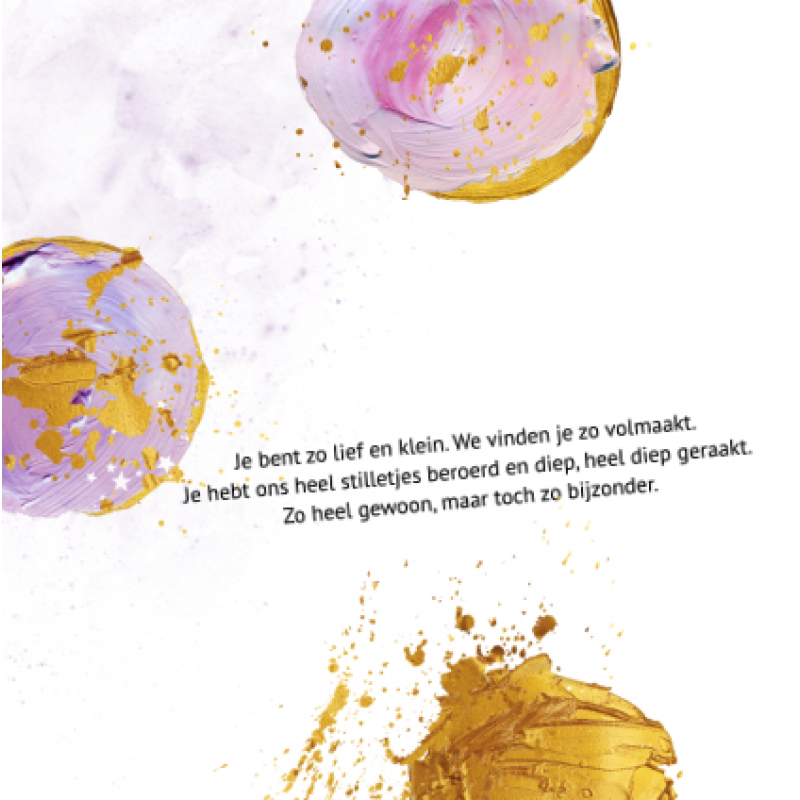 Hip geboortekaartje voor een meisje met lila en goud kleurige verf.