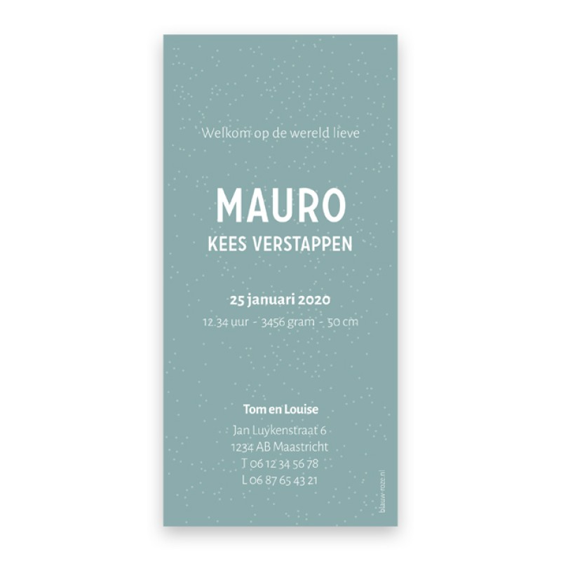 Hip strak geboortekaartje met stippen. Wil je liever andere kleuren of een ander lettertype? Dit kan je gemakkelijk aanpassen in de editor.