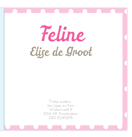Hip en lief geboortekaartje met een getekend wolkje en een achtergrond met polkadots en hippe iconen om tijd, gewicht en lengte aan te duiden. De roze achtergrondkleur kan worden aangepast.