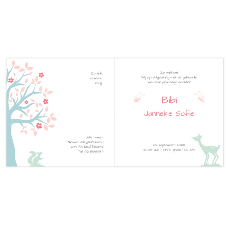 Lief geboortekaartje met een boom, een hertje en eekhoorn op een kraft ondergrond, heel geschikt voor een lente of zomer kindje. Pas zelf de kleuren, de tekst en het lettertype aan. Hippe geboortekaart voor jullie kleine zoontje of dochtertje van JilleJille.nl. Proefdrukje inclusief alle papierstalen kost maar €1,- en verzenden is gratis!