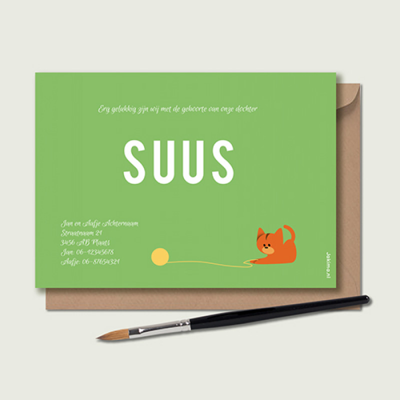 Enkel geboortekaartje waarop in het groot een meisjesnaam in strakke letters staat. Op en voor de naam zijn katten aan het spelen.
