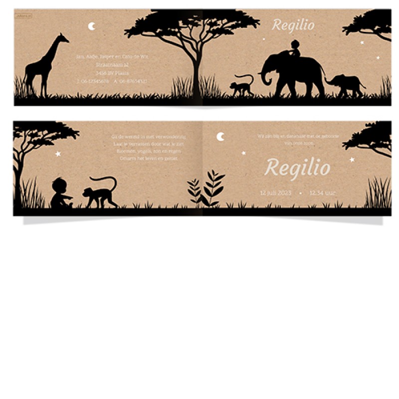 Stoer geboortekaartje met een jongetje dat op een olifant zit. Samen met een aapje en een kleinere olifant maken ze een optocht door de jungle. Dit is een DIY-kaartje: van het jongetje kun je makkelijk zelf een meisje maken. Ook alle (achtergrond) kleuren, afbeeldingen en teksten zijn zelf aan te passen.