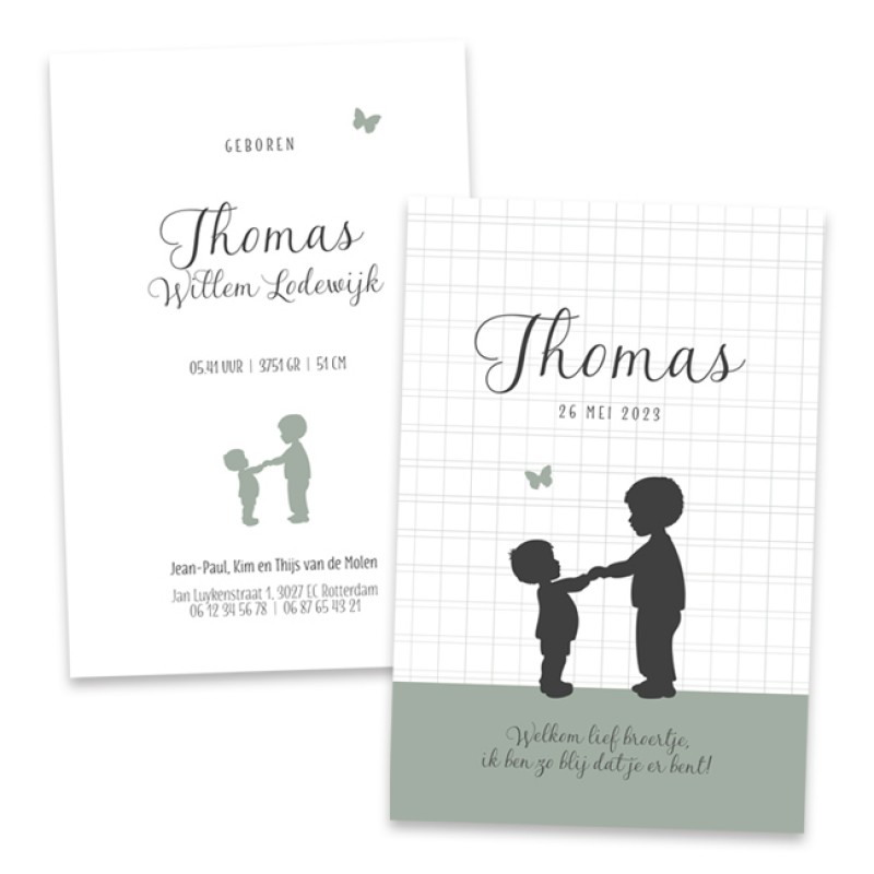 Lief silhouet geboortekaartje met een grote en kleine broer. Vul jullie eigen gegevens in, zo leuk om de naam van jullie kindje op het kaartje te zien staan!- en maak het kaartje helemaal naar jullie eigen wens. Heb je een vraag of kom je er niet uit, mail dan gerust!