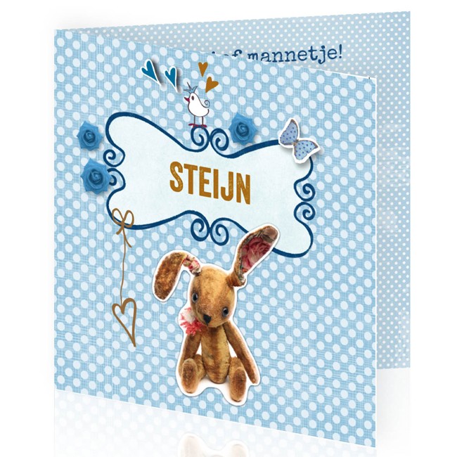 Retro vintage geboortekaartje voor een zoon met een lief knuffeltje op een vintage blauwe ondergrond met stippen. Een klassiek naamkader met de naam van jullie kleine mannetje in een stoer lettertype.