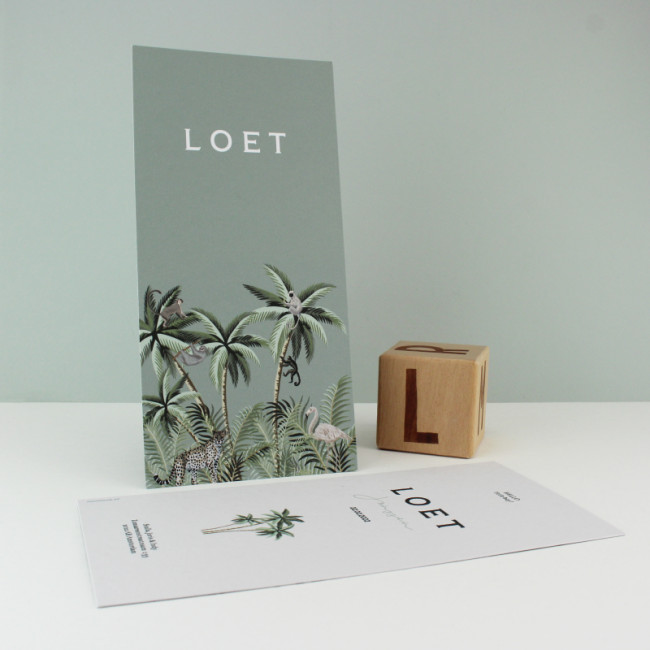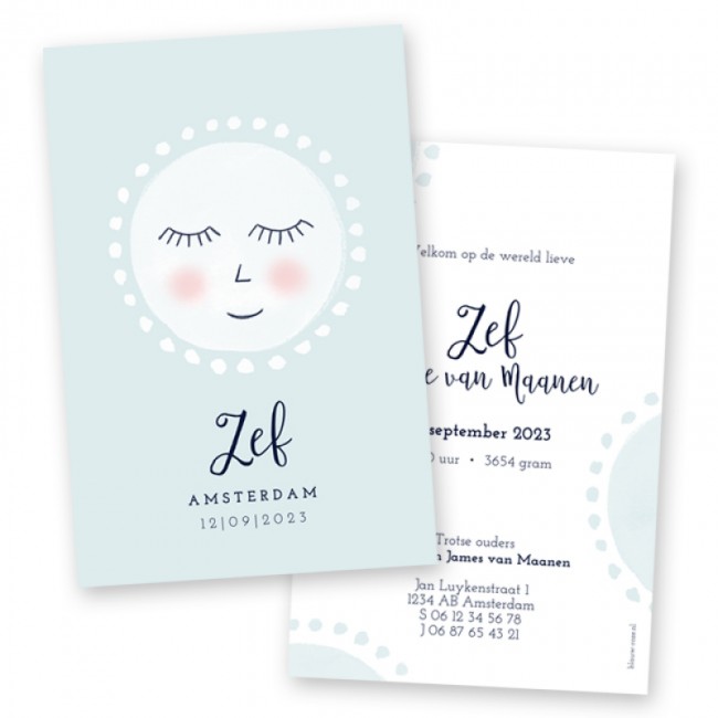 Prachtig blauw geboortekaartje met een jeans blauwe kleur op de achtergrond. De naam staat in strakke letters en wordt gedrukt in koperfolie. Je kunt zelf ook kiezen voor andere soorten foliedruk.