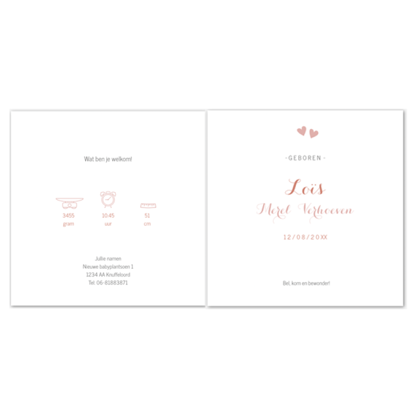 Lief geboortekaartje met het silhouet van een meisje in koper foliedruk en een velvet achtige achtergrond met bladeren. De kleuren van deze kaart kun je zelf aanpassen evenals de folie kun je omzetten naar goud, rosé, zilver of zwart.