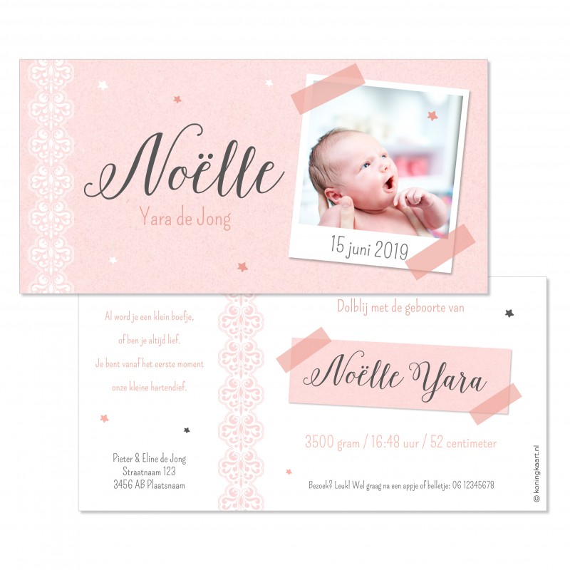 Geboortekaartje met kraft achtergrond en polaroid foto Klassiek geboortekaartje met een kraft achtergrond en een polaroid kader waar je een eigen foto in kunt plaatsen. Aan de linkerkant staat een kanten strook.