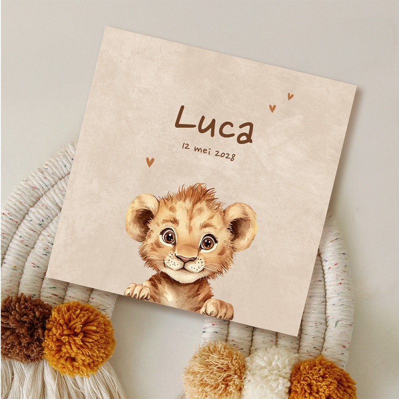 Deze geboortekaart heeft een warm beige ontwerp met een waterverf illustratie van een jong leeuwtje dat over het randje van de kaart kijkt. Subtiele hartjes maken het ontwerp compleet. De dubbele vierkante kaart biedt voldoende ruimte om alle details van jullie kindje te delen. Via onze editor kun je de kaart eenvoudig aanpassen met eigen teksten, kleuren en lettertypes. Bestel een proefdruk om het resultaat vooraf te bekijken.