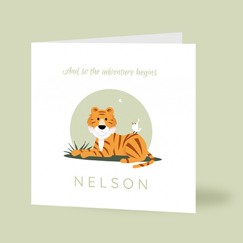Stoer geboortekaartje met een liggende tijger op de voorkant. Je kunt zelf heel makkelijk teksten aanpassen, en met code PK-01 is je eerste proefkaartje gratis!