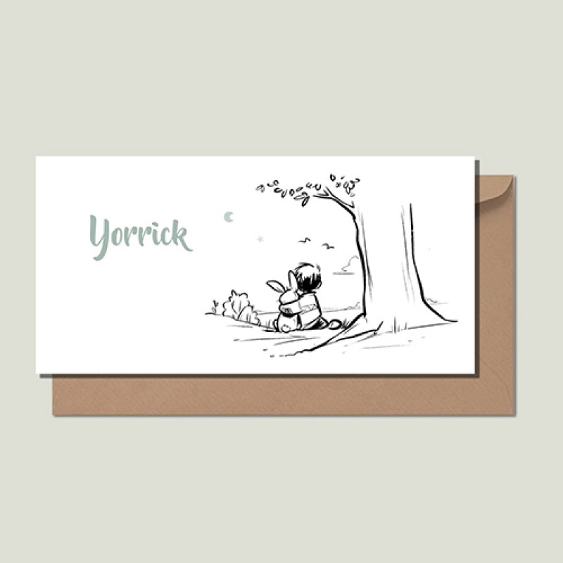 Lief geboortekaartje waarop een lijntekening van een jongetje en eenkonijn, van de rug af gezien. Ze zitten in het gras en kijken naar het sterretje en de maan in de lucht. Ook beschikbaar voor een meisje!