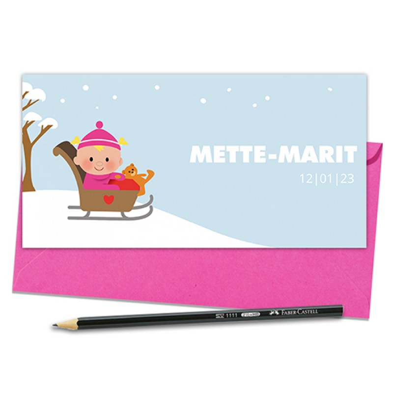 Sfeervol winters geboortekaartje met een meisje dat in een arrenslee zit en de heuvel afgaat. Dit kaartje is er ook voor een jongetje. Met code PK-01 is je eerste proefkaartje gratis!