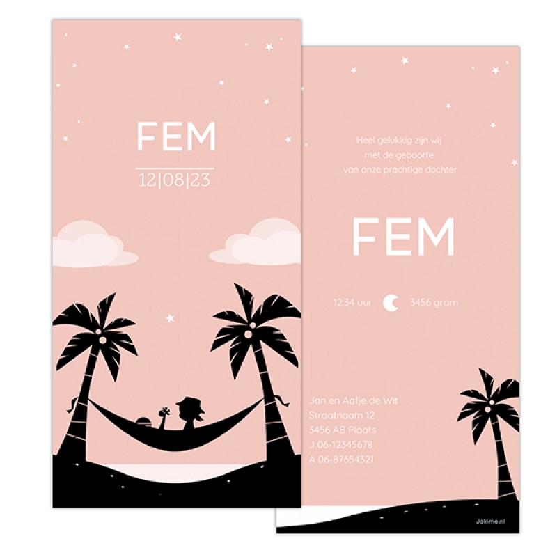 Langwerpig enkel geboortekaartje in een tropische sfeer. een meisje zit in een hangmat op het strand. Je ziet palmen, de zee en sterren in de lucht. Alle kleuren en teksten zijn aan te passen en met code PK-01 is je eerste kaartje gratis!