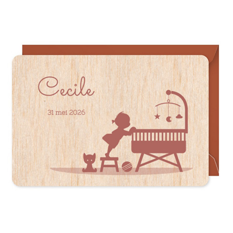 Geboortekaartje waarop een meisje op een kruk staat en over de rand van de wieg naar het pasgeboren zusje kijkt. Erg hip omdat het op hout is gedrukt! Je kunt al een proefkaartje op hout bestellen voor € 2,50.