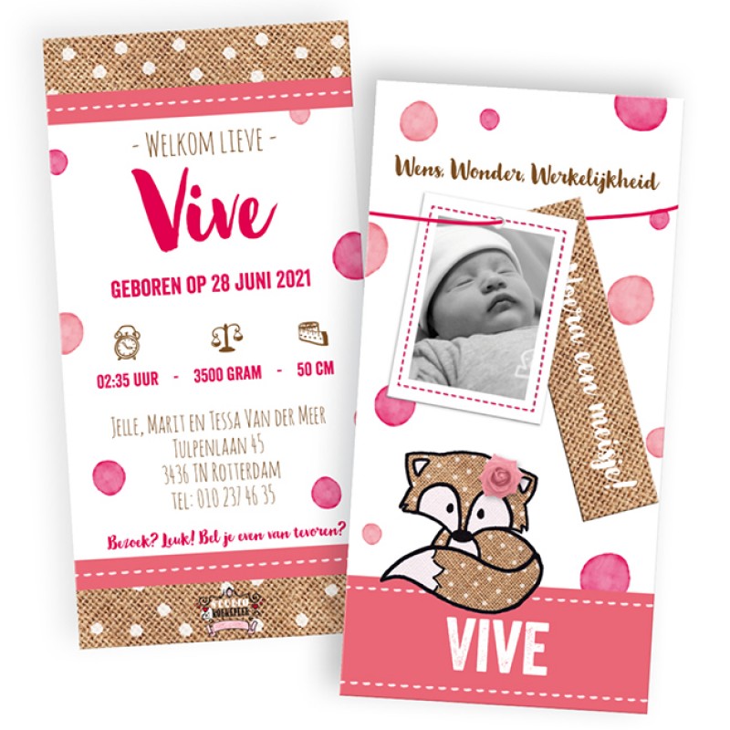 Geboortekaartje met losse labeltjes voor de foto en een tekst, met een schattig vosje voor jouw lieve dochtertje. Stel de kaart geheel naar eigen wens samen met onze handige online ontwerptool. Bestel een gratis proefkaartje met de code GPHAPPY . Wil je liever persoonlijk geholpen worden? Ons team staat altijd gratis voor jullie klaar.