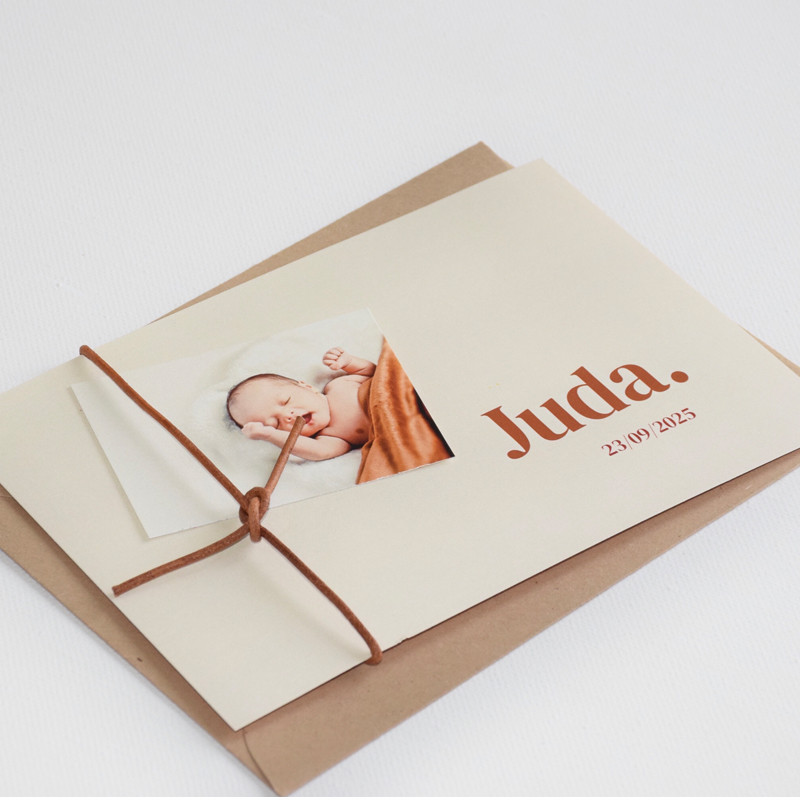 Zo mooi dit minimalistische geboortekaartje. De achtergrond is creme en de naam staat in een klassiek lettertype. Maak het kaartje af met een mooie foto en een leren touwtje. Maak de tekst van het kaartje passend bij de foto voor een mooi geheel. Heb je hulp nodig, vraag gerust!