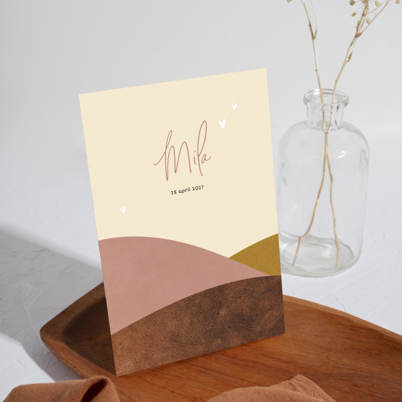 Een trendy geboortekaartje met minimalistische opmaak. Op de voorkant staan abstracte vormen die samen een landschap vormen. De subtiele texturen in de vormen geven dit kaartje wat meer diepte. In de okergele zit bijvoorbeeld een patroon van bladeren. De naam van je pasgeboren dochtertje komt in sierlijke typografie boven het landschap te staan.