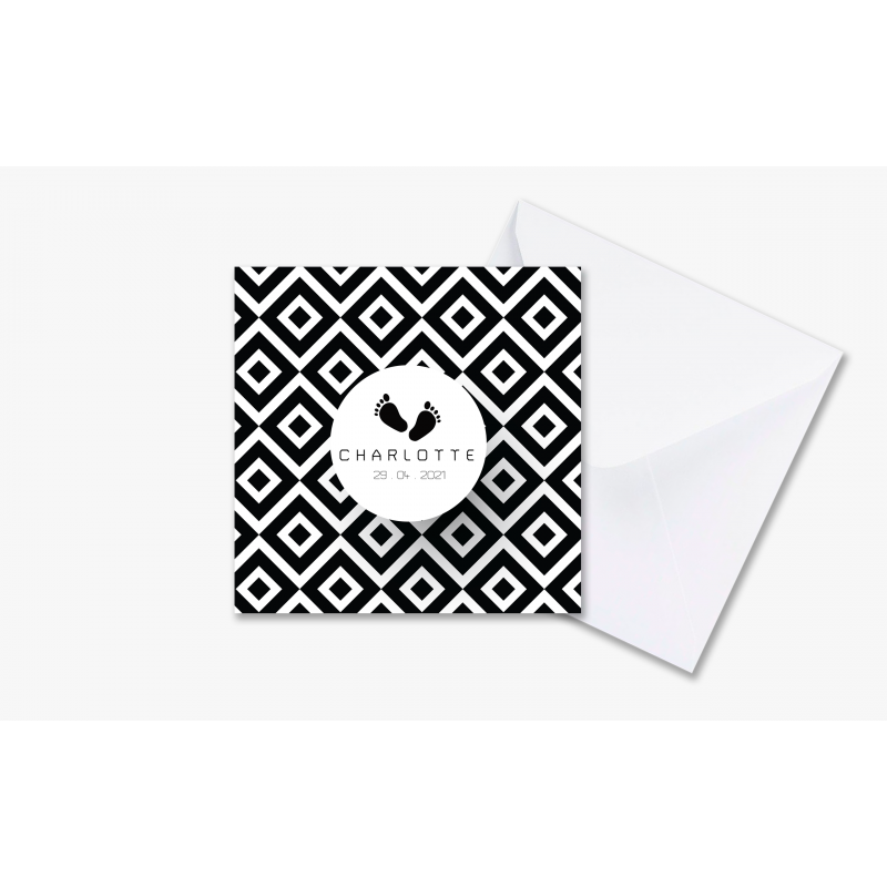Een modern geboortekaartje met zwart en witte vormen en zwarte voetjes.