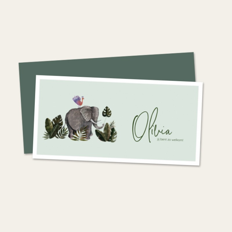 Prachtig handgetekend geboortekaartje in een jungle thema met een olifant met een vogel op zijn rug. Daarbij mooie groene jungle bladeren. De achtergrond is mintgroen en kan je zelf aanpassen in kleur.