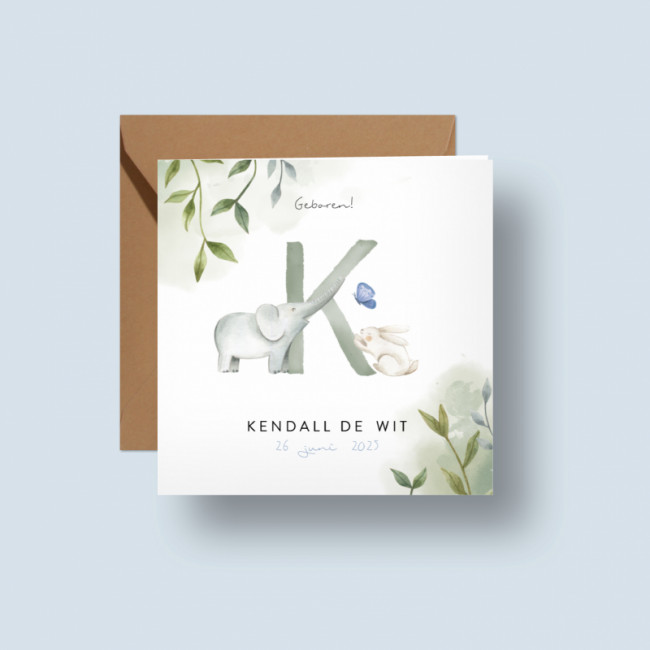 Geboortekaartje met een olijfgroene structuur achtergrond met een olifant, hartjes en stippen in goudfolie.