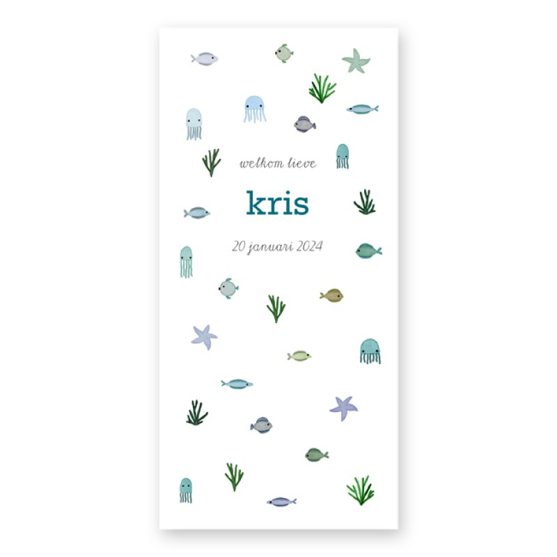 Vrolijk geboortekaartje van de onderwaterwereld met vissen en zeesterren. Pas de tekst, het lettertype en de tekstkleur aan en maak er jullie eigen persoonlijke geboortekaartje van. Heb je vragen of vind je het fijn als we je helpen bij het ontwerp, stuur dan gerust een mailtje!