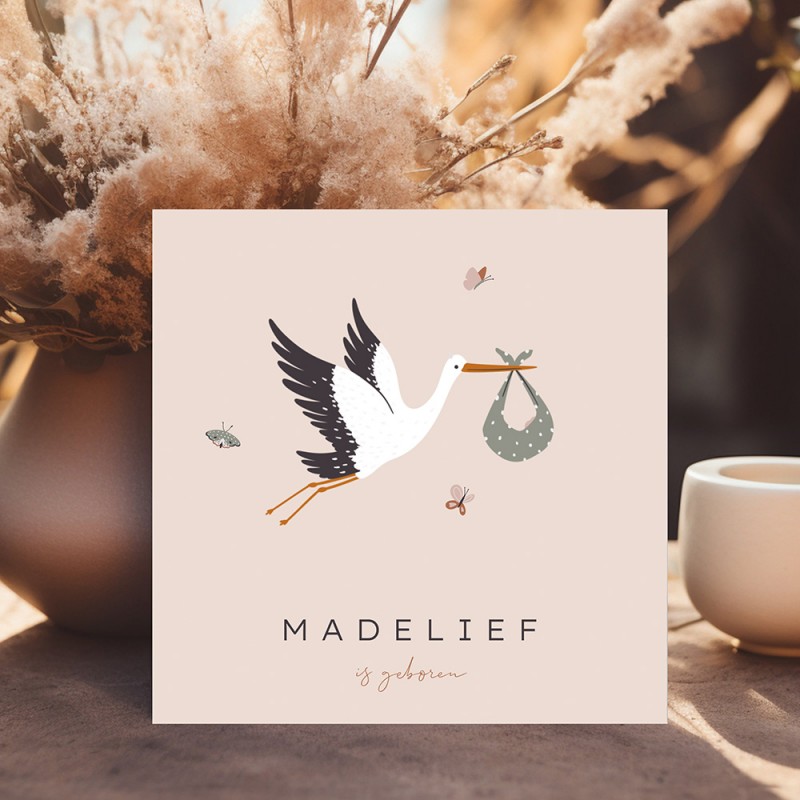 Een lieflijk geboortekaartje voor een meisje, met een vriendelijke ooievaar die een kindje in een groene knapzak draagt. Binnenin een wiegje met een zachtroze dekentje en feestelijke ballonnen zwevend in de lucht, te midden van dartelende vlinders. Personaliseer het kaartje eenvoudig met onze editor en bestel een proefdruk.