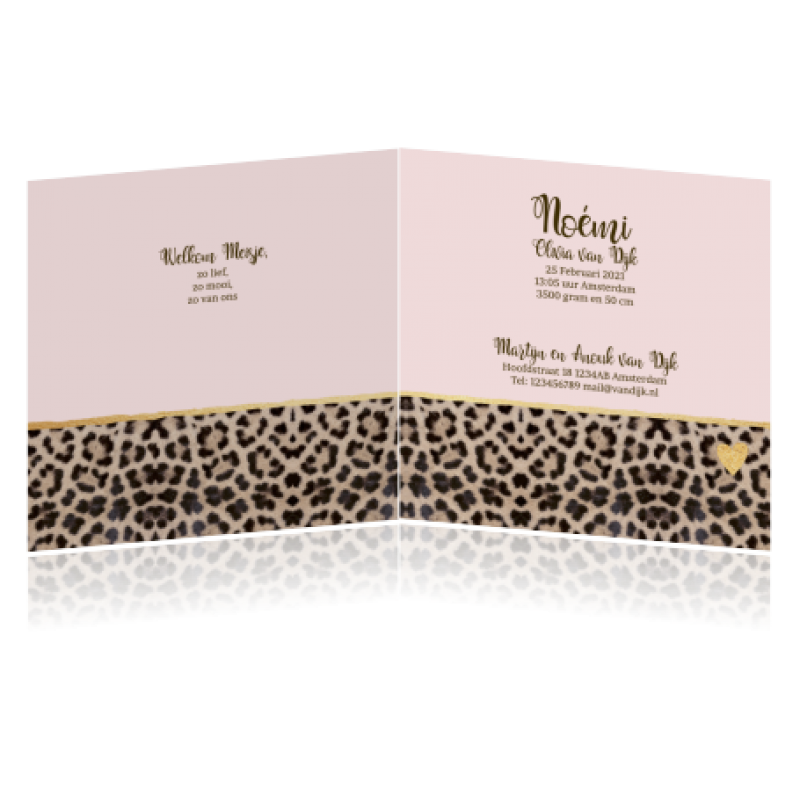 Een hip geboortekaartje met panterprint, fotostrip en hartje. De roze achtergrondkleur is aanpasbaar. Vervang ook de foto's en pas de tekst aan.