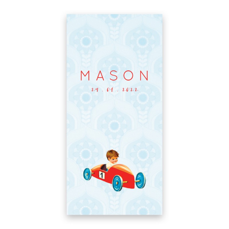 Stoer nostalgisch geboortekaartje met raceauto. Pas dit kaartje eenvoudig aan naar jullie wensen in de editor.