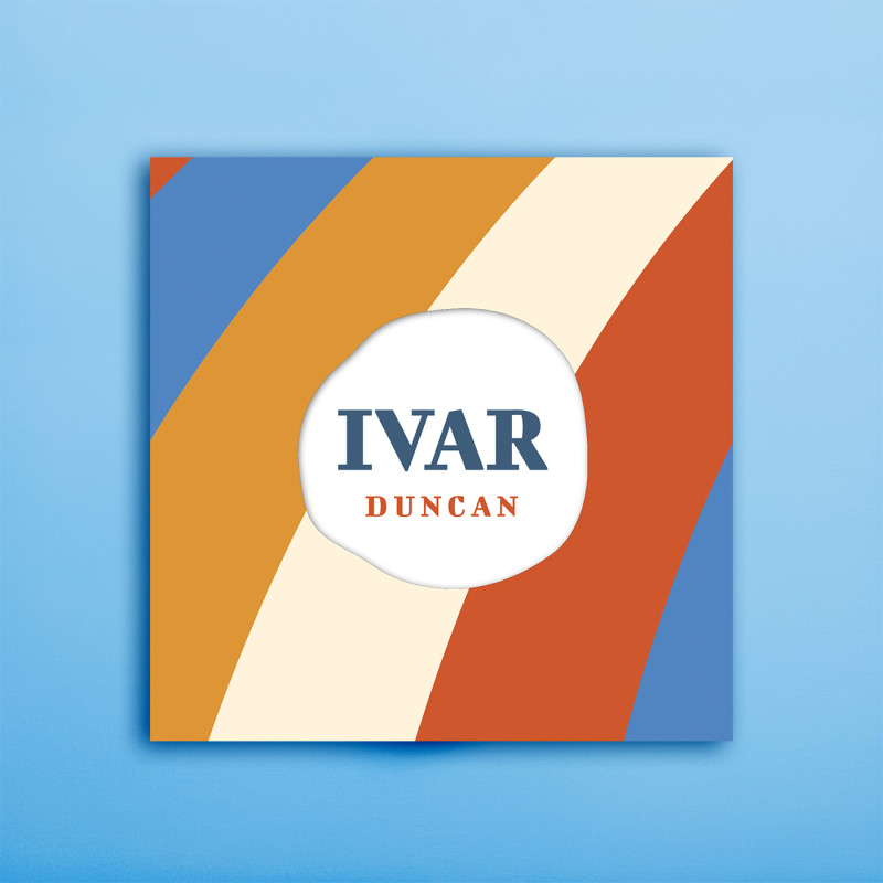 Hip geboortekaartje voor een jongen met strepen in mooie retro kleuren blauw, okergeel en oranje. Voorop is grove cirkel uitgesneden (als een doorkijkje) waardoor je de rechter binnenzijde ziet waar de naam staat. Er zit dus voorop een gat in dit retro geboortekaartje, hoe leuk is dat.