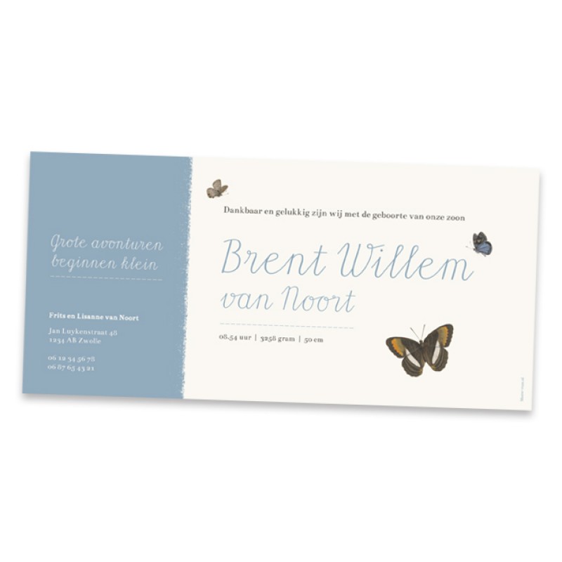 Lief geboortekaartje met vlinders en blauw vlak. De vlinders zijn een afbeelding van het Rijksmuseum via de Rijksstudio. In de editor kun je dit kaartje eenvoudig aanpassen naar je eigen wensen. Heb je hulp nodig of vragen, mail gerust.