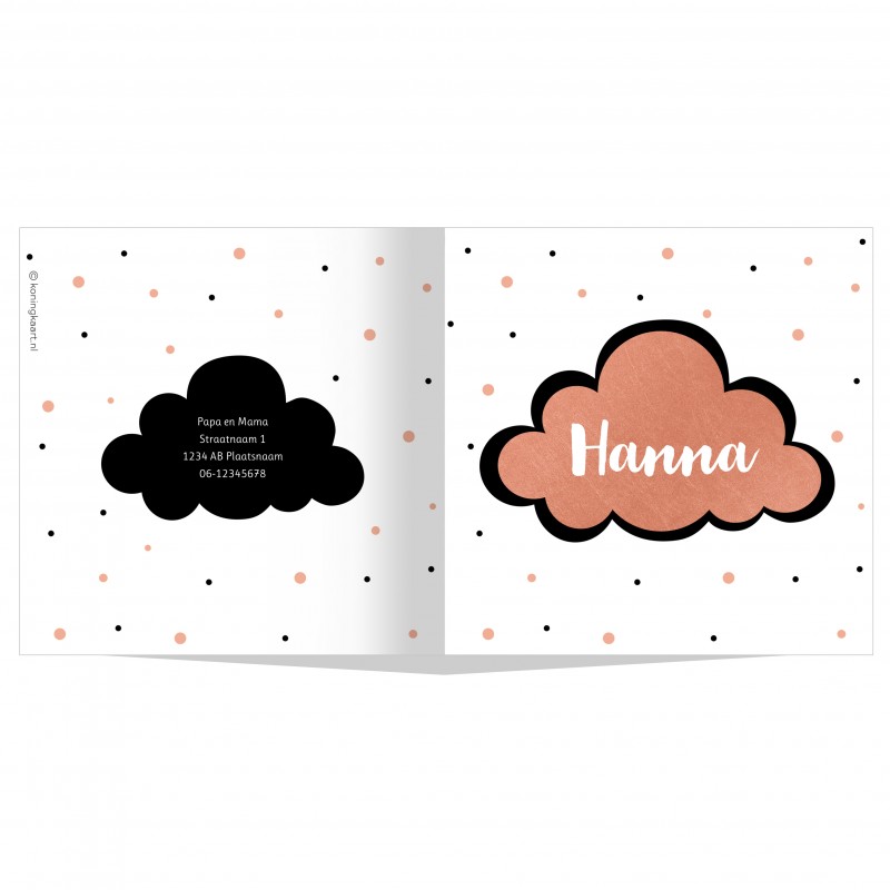 Leuk geboortekaartje met een zwart en rosé gold wolkje, omringd door vrolijke stippen. In de kaart kun je een klein gedichtje plaatsen.