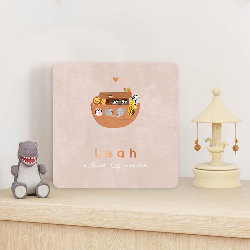 Vrolijk geboortekaartje in oudroze kleur met koperfolie naam en illustratie van de ark van Noach. Een leuke kaart om de komst van je dochtertje mee aan te kondigen aan vrienden en familie. Een aantal dieren komen op de achterkant van dit enkele kaartje terug. Perfect als je op zoek bent naar een geboortekaartje met Christelijk thema. Pas dit kaartje naar eigen wens aan in onze editor en bestel een proefdruk.