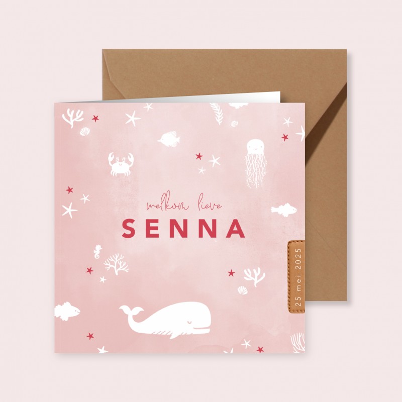 Een schattig en hip geboortekaartje met zachtroze waterverf achtergrond, een patroon van witte zeediertjes en donkerroze typografie. Op het kleine leren labeltje (let op: dit is een gedrukte afbeelding en geen fysiek labeltje van leer) kun je de geboortedatum van je kindje plaatsen. Aan de binnenzijde van dit geboortekaartje is ruimte voor een foto van je pasgeboren dochtertje en komen de geïllustreerde zeedieren terug. Verander gemakkelijk de achtergrond of lettertypes in onze designtool.