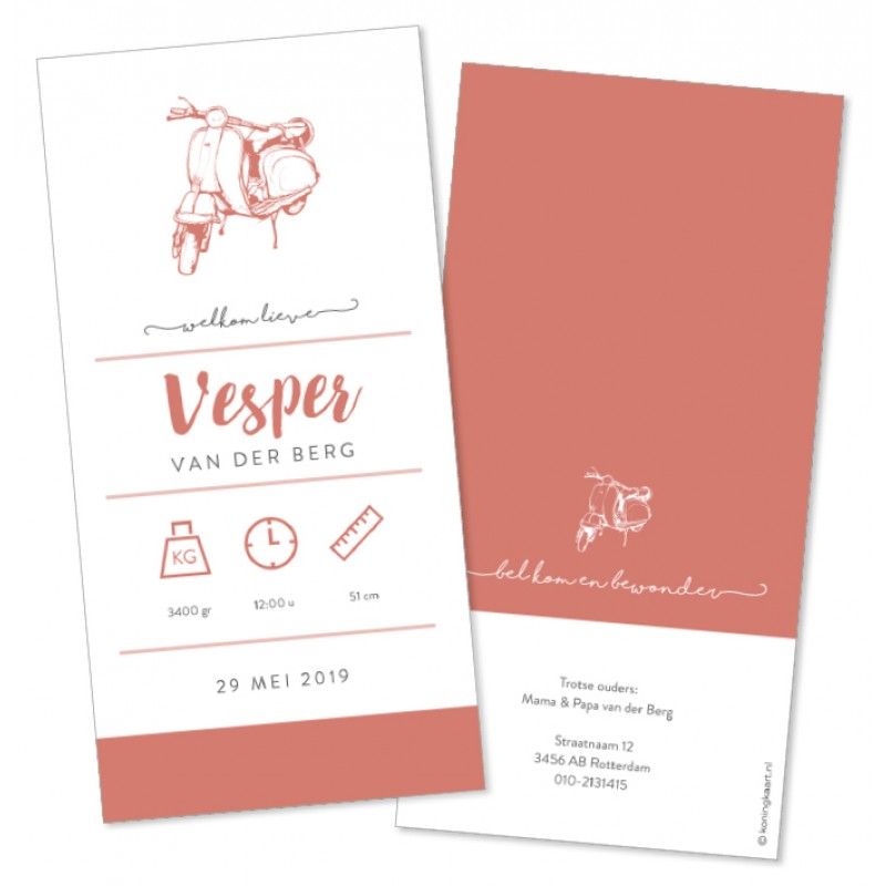 Een trendy geboortekaartje met een geïllustreerde, roze scooter voorop. Op de voorkant staan icoontjes met het gewicht, de lengte en tijd. De achterkant is roze met een witte scooter. Hier kun je de adresgegevens plaatsen.