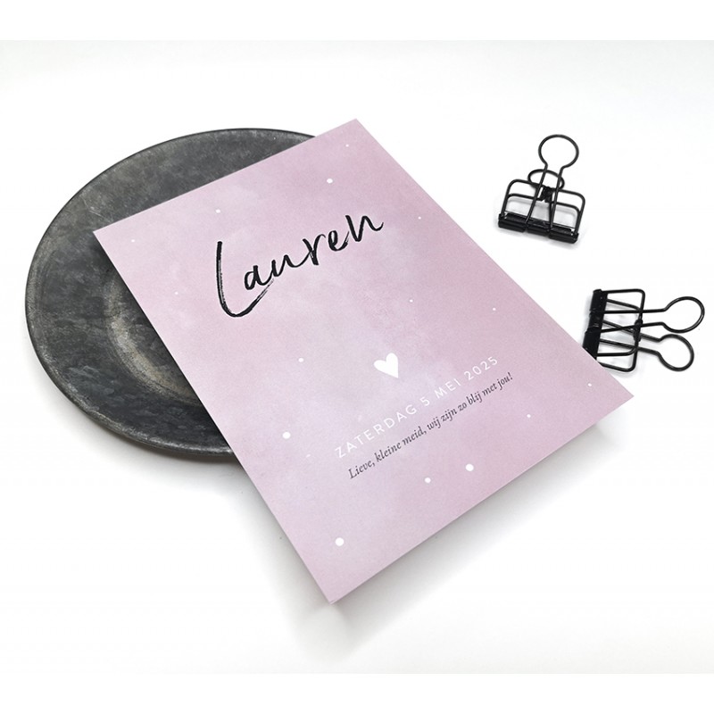 Prachtig, enkel geboortekaartje in de kleur oudroze. De achtergrond is geschilderd met roze waterverf en is versierd met witte stipjes en een hartje. De naam van je dochter staat groot bovenaan de kaart met een trendy lettertype. Pas de kaart naar wens aan in de ontwerptool en bestel een proefdruk om het gedrukte resultaat te bekijken.