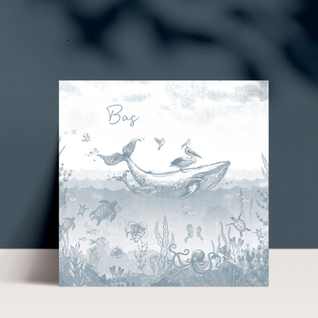 Strak en typografisch dubbel geboortekaartje. Een jongetje zit op zijn eigen naam en kijkt naar een vogeltje. Heel makkelijk aan te passen voor een meisje.