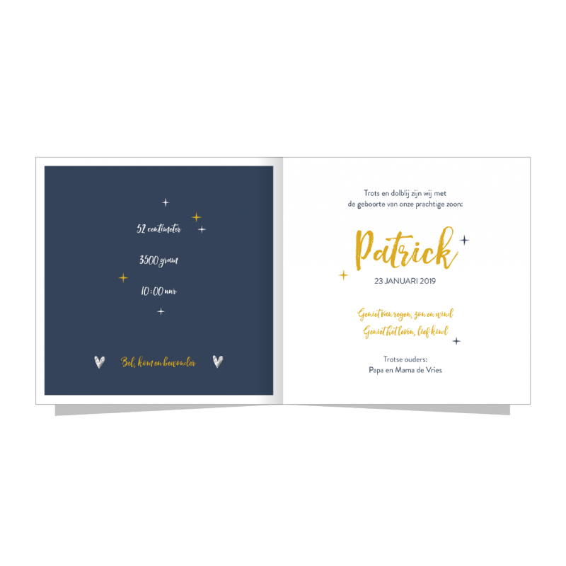 Schattig, vierkant geboortekaartje met blauwe vlakken. Op de voorkant zie je een silhouette van een jongetje op de maan. De kaart is versierd met gele sterren en zilveren hartjes. In de kaart kun je alle gegevens naar wens aanpassen.