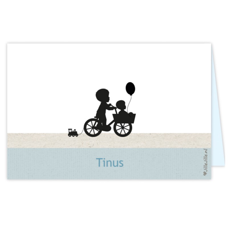 Lief liggend silhouet geboortekaartje van JilleJille met grote broer en klein broertje op de fiets, met takjes, bloemetjes, een ballon en verschillende soorten papier als een collage op de achtergrond, kleur zelf de de tekeningen naar eigen idee. Een proefdrukje met papierstalen heb je al voor €1,- in huis en verzenden is gratis bij JilleJille.nl