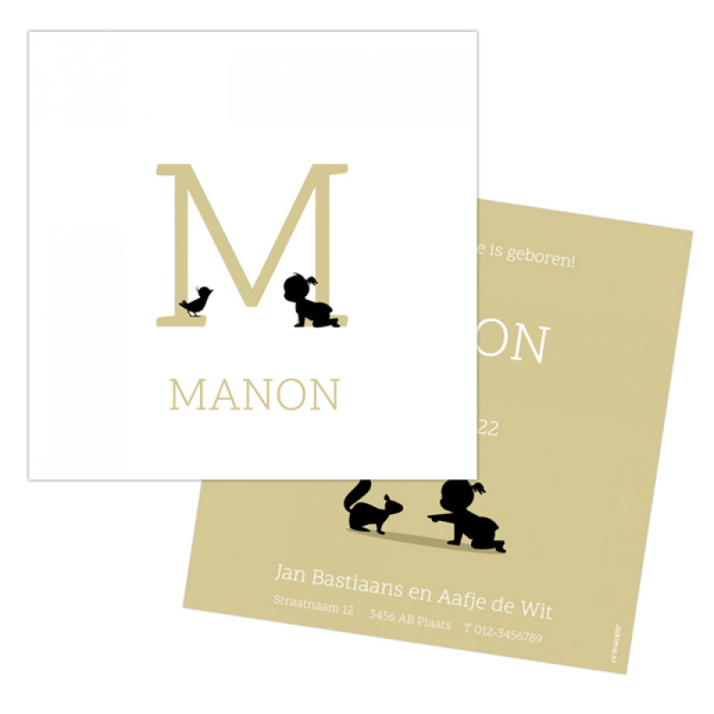 Grafisch enkel geboortekaartje. Een meisjessilhouet zit op haar knietjes en kijkt naar een vogeltje. In het groot op de achtergrond staat de eerste letter van haar naam. Strak en simpel kaartje, helemaal van deze tijd! Je kan dit kaartje heel makkelijk zelf aanpassen: het geslacht van het kindje, de (achtergrond) kleur, de naam. her is een echt DIY kaartje. En met code PK-01 is je eerste proefkaartje gratis!