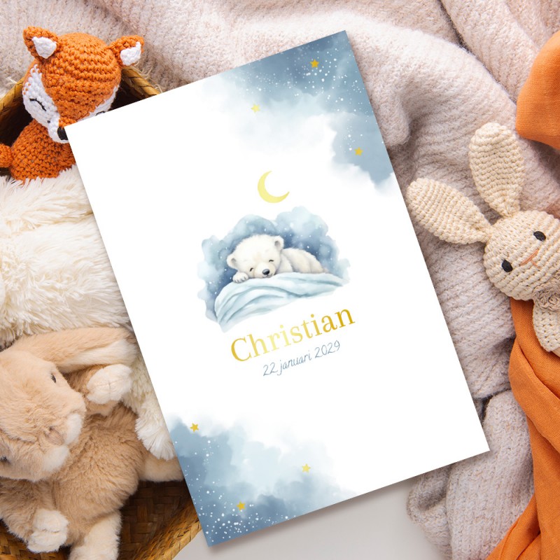Wordt jouw zoontje deze winter geboren? Misschien is het leuk zijn geboorteseizoen te verwerken in de aankondiging van zijn geboorte! Ga voor dit schattige geboortekaartje met goudfolie sterretjes en maan, een slapend ijsbeertje en blauwe waterverf. Een kaartje dat perfect past bij een winterkindje! Pas dit ontwerp eenvoudig aan in onze editor en bestel een proefdruk.