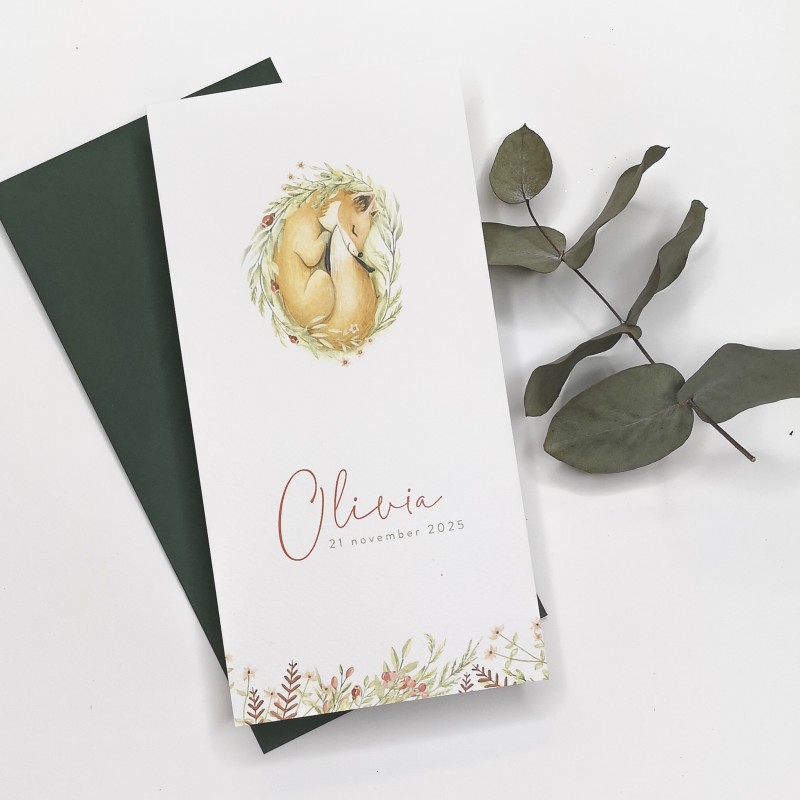 Dit langwerpige geboortekaartje is perfect voor het aankondigen van de geboorte van een herfstkindje! Op de voorkant staat een illustratie van een slapende vos omringd door takjes en bloemen. Op de achterkant komt de vos terug en kun je alle informatie over je pasgeboren zoontje plaatsen.