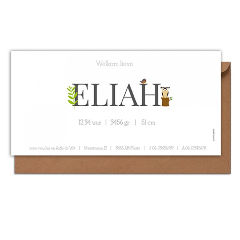 Lief enkel geboortekaartje waarop de eerste letter van de naam van je kindje in het groot centraal staat.Je ziet een struisvogel en een uil op en achter de naam staan. De letter, de kleuren en ook de dieren kun je aanpassen naar je eigen smaak en inzicht..