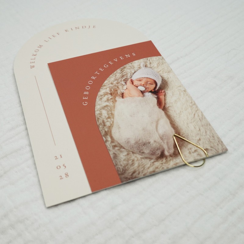 Vier de aankomst van je kleine wonder met ons unieke geboortekaartje! Ontworpen om te verrassen, bestaat dit kaartje uit drie losse delen in trendy terra en zacht beige. Met een leuke paperclip worden de kaartjes samengevoegd, waardoor jullie aankondiging niet alleen liefdevol is, maar ook nog eens origineel. Er is ruimte voor een eigen foto, voor een persoonlijke finishing touch. Maak van deze geboorteaankondiging een blijvende herinnering met dit bijzondere geboortekaartje!
