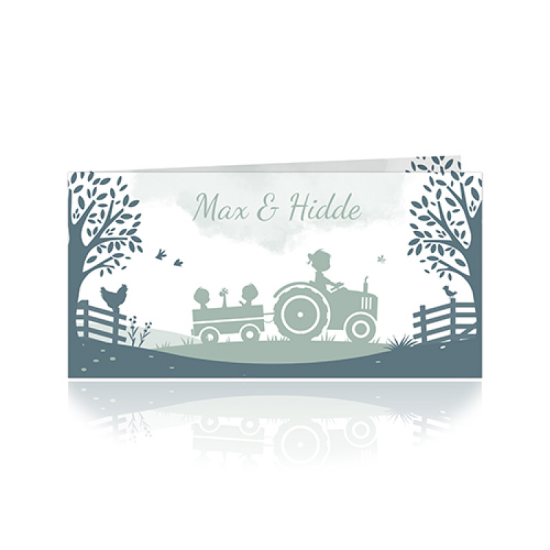 Sfeervol geboortekaartje waarop je een tweeling ziet die in een kar zit, getrokken door een tractor die bestuurd wordt door hun oudere zusje. Ze rijden door een heuvelachtig landschap. Het kaartje is opgebouwd uit lagen en daardoor kun je van de tweeling erg makkelijk een enkel meisje of jongetje maken.
