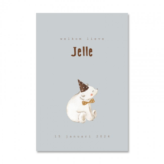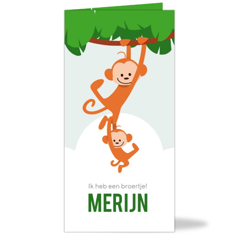 Vrolijk geboortekaartje met twee aapjes die aan een tak hangen. Op de kaart zijn alle dieren heel makkelijk zelf te verplaatsen of te vervangen. Voeg een tijger, leeuw, toekan, luiaard, olifant of giraf toe en maak er je eigen jungle van!