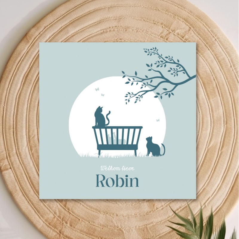 Geboortekaart met een wiegje in het gras en twee nieuwsgierige poesjes, alles in silhouet. Pas het kaartje voor je zoontje aan in de editor en bestel een proefdruk.