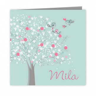 Lief geboortekaartje voor een tweeling met twee rotan wiegjes. Een mandje met roze strikjes en het ander wiegje met groene strikjes met een eekhoorn, vlinder, egel, roodborstje en twee lieveheersbeestjes eromheen. In de achtergrond een mintgroene watercolor vlek.