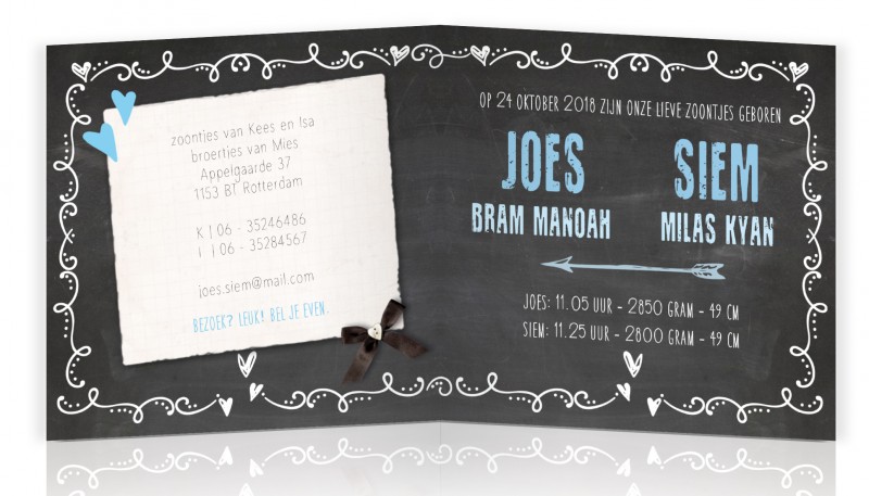 Schattig krijtbord geboortekaartje voor 2 jongens. Het vaandel, de hartjes en de tekst zijn eenvoudig om te kleuren, waardoor het kaartje ook heel geschikt is voor één jongen en één meisje.