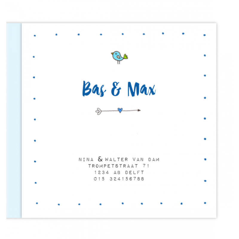 Een lief geboortekaartje voor een jongenstweeling met olifanten, een vogel en een bloem op blauw.