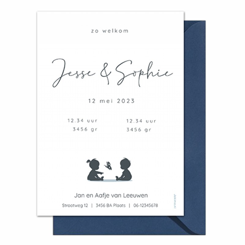 Sfeervol enkel geboortekaartje voor een tweeling. De geslachten van de kinderen kun je heel makkelijk zelf aanpassen. Ook de kleuren en tekst zijn aan te passen. En met code PK-01 is je eerste kaartje gratis!