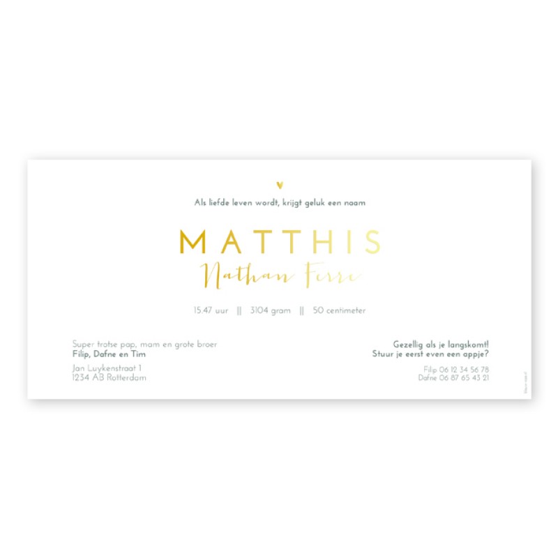 Typografisch geboortekaartje met de tekst in goudfolie. Pas het kaartje in de editor eenvoudig aan naar jullie eigen wensen. Misschien wil je liever een knallende achtergrond, een ander lettertype of liever koper- of zilverfolie. Voor vragen en wensen mag je altijd contact met ons opnemen.